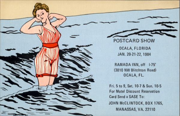 Postcard show Ocala, Florida Jan, 20-21-22, 1984. Ramada Inn, off 1-75 (3810 NW Blitchton Road) Ocala, Fl. Fri. 5 to 9, Sat. 10-7 & Sun. 10-5 for Motel Discount Reservation Card Send a Sase to John McClintock box 1765 Manassas, Va. 22110.