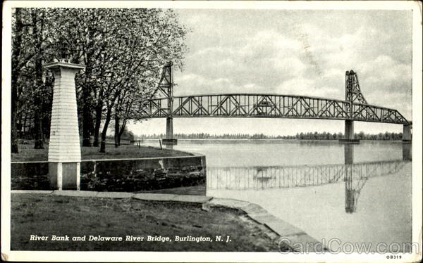Front: River Bank and Delaware River Bridge, Burlington, N. J. ОВ319 Back: GENUINE CURTEICH-CHICAGO “C.T. PHOTO-FINISH" POST CARD-(REG. U.S. PAT. OFF.)
