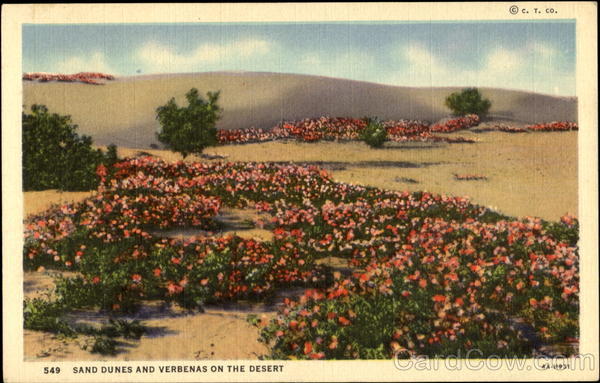 Front: Oc. T. co. 4A-H931 549 SAND DUNES AND VERBENAS ON THE DESERT Back: “C.T.ART-COLORTONE” REG.U.S. PAT. OFF. MADE ONLY BY CURT TEICH & Co., INC., CHICAGO HERZ POST CARDS, 1565 EBERS STREET, SAN DIEGO, CALIF.