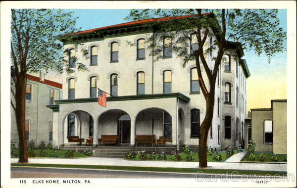 Front: 115 ELKS HOME, MILTON, PA. 104737 Back: PUBLISHED BY W. A. REED ESTATE, MILTON, PA. T. AMERICAN ART COLORED