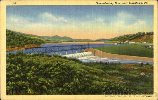 Front: J-4 Quemahoning Dam near Johnstown, Pa. 7A-H3802 Back: MINSKY BROTHERS & Co., PUBLISHING DIVISION, PITTSBURGH, PA. "C.T.ART-COLORTONE' REG.U.S. PAT. OFF.