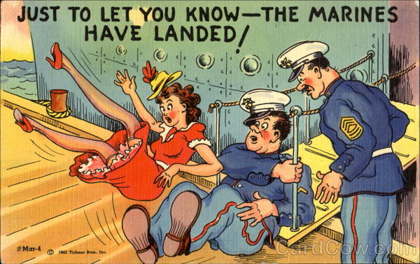 Front: JUST TO LET YOU KNOW-THE MARINES HAVE LANDED/ # Μar-4 © 1943 Tichnor Bro. Inc. Back: MADE IN U, S. A 'TICHNOR QUALITY VIEWS" REG. U.S. PAT, OFF. MADE ONLY BY TICHNOR BROS., INC., BOSTON, MASS. 74327 MARINE COMICS - 10 DESIGNS
