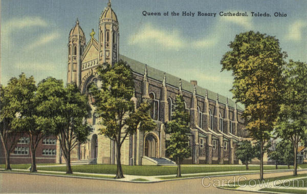 Front: Queen of the Holy Rosary Cathedral, Toledo, Ohio Back: MADE IN U. S. A "TICHNOR QUALITY VIEWS REG. U.S. PAT. OFF. MADE ONLY BY TICHNOR BROS., INC., BOSTON, MASS. 65931 PUB. BY HIRSCH NEWS AGENCY. TOLEDO, OHIO