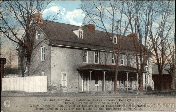 The Bird Mansion Birdsboro, Berks County, Pennsylvania. Erected by William Bird in 1751. Where James Wilson, Signer of Declaration of Independence, was Married. Remodeled in 1921 for the Home of the Birdsboro Y. M. C. A.