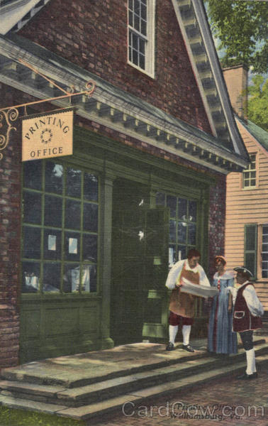 Front: PRINTING OFFICE Printing Office Williamsburg. Va. Back: The Printing Office where an eighteenth century hand press is used to turn out print- ing as was done in Williamsburg, Virginia, 200 years ago. 1C-H75