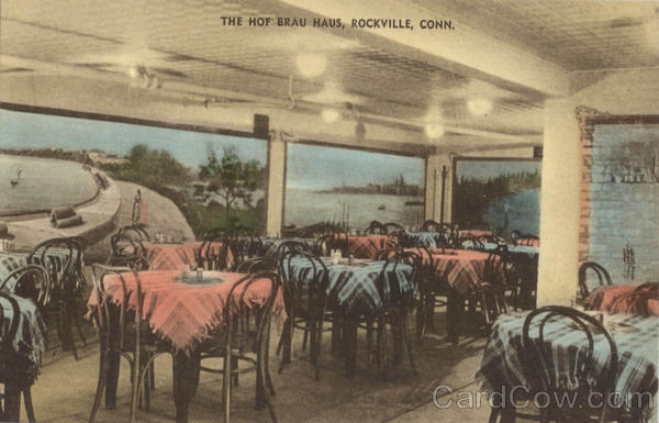 Front: THE HOF BRAU HAUS, ROCKVILLE, CONN. Back: HAND COLORED THE HOF BRAU HAUS Connecticut's Most Beautiful Restaurant and Rathskeller 26 Village Street, Rockville, Conn. Published by THE COLLOTYPE Co., Elizabeth, N.J. and N.Y.
