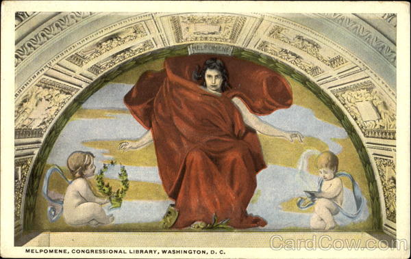 Melpomene - by Edward Simmons. Melpomene, Muse of Tragedy. Has the tragic mask. The genil hold laurel crown and brazier of fire. From Practical guide Library of congress.