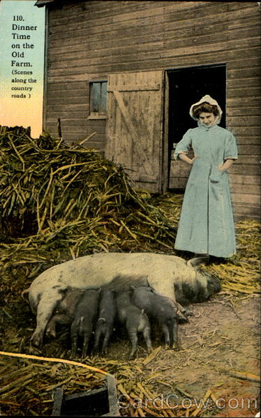 Front: 110. Dinner Time on the Old Farm. (Scenes along the country roads) Back: E. A. BISHOP, PUB., RACINE, WIS. MESSAGE MAY BE WRITTEN ON THIS SIDE and Island Possessions Cuba, Canada and For Foreign. A-11215 L