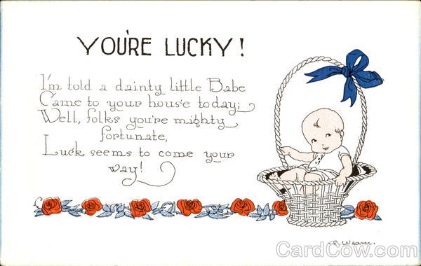 Front: YOU'RE LUCKY! I'm told a dainty little Babe Came to your house today; Well, folks you're mighty_ fortunate, Luck seems to come your Day! - E.Weaver. Back: No. 2358, 10 des. STORK CONGRATULATIONS. Made in U. S. A.