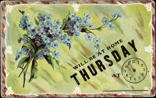 Front: WILL BE AT HOME THURSDAY 12 10 3: AT 8 76 5 Back: (A) 23/8 DSWOR POST CORDS PHIC U.S.POSTALNE Aars Jorane Ferial Best Evehong & Afrom 325 Chian