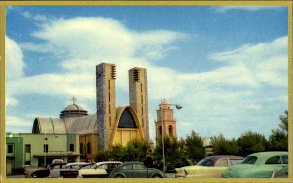 TARJETA POSTAL Mexfotocolor Costado de la Plaza y Templo Side of the Square and Church Reynosa, Tamps. Mex. Sr.. "México Fotográfico" Apartado 1934 México Impresión Original 54 IMPRESO EN MEXICO