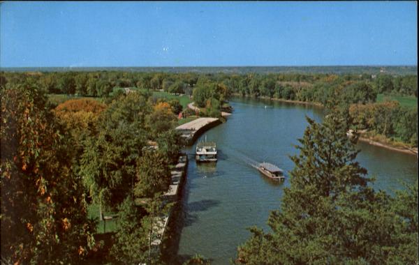 Looking down the scenic Illinois River from the top of famous Starved rock, just west of Ottawa and east of La Salle-Peru, Ill., south of new Interstate 80. the Cruise boat is seen just leaving the dock.