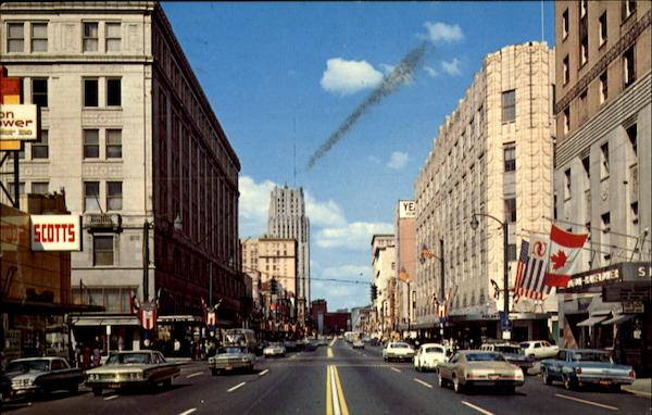 | Main Street is the heart of downtown Akron and is prominent with many fine shops, office buildings. Department stores and hotels. This view is the parade area for the city's many national events such as the Soap Box Derby, the P.G.A Golf Tournament, and many civic events. |