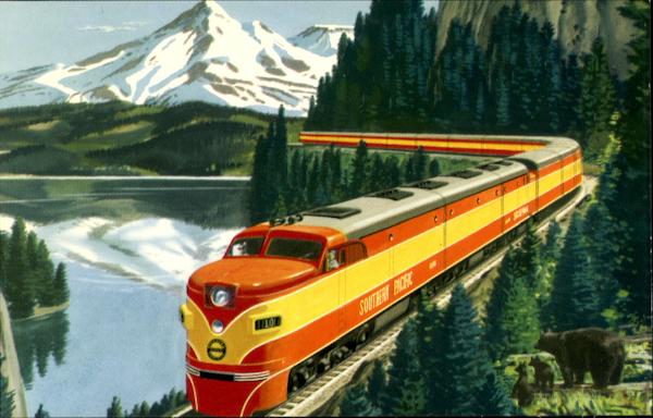 Front: 1110 SOUTTERY PACFIC Back: Southern Pacific's Streamliner "Shasta Day- light" passing 14,161-foot Mt. Shasta, on the scenic 718-mile Shasta Route between Port- land, Oregon and San Francisco, California. Lithography By Stecher-Traung