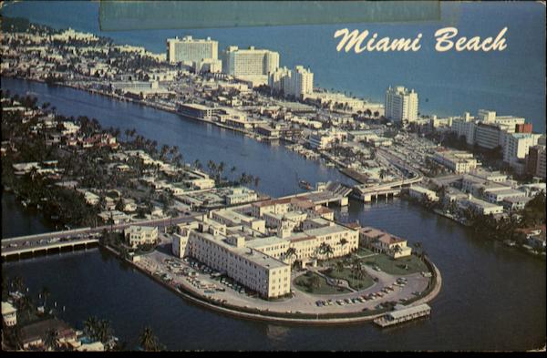 Exclusive North Beach section with its famous Hotel Row and St. Francis Hospital in the foreground at Miami Beach, Florida. |