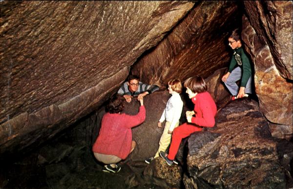 | Polar Caves located 4 miles west of Plymouth, New Hampshire on Route 25, one of nature's most spectacular mineral and rock formations. The Lemon Squeeze here is one of the amusing challenges in this unusual place. Father – he's no party pooper – shows he can do it, well with some encouragement from the family. |