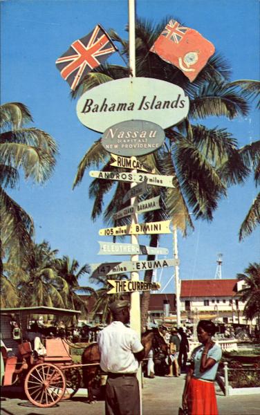 “Show me the way to .........................” Sign post in Rawson Square, Nassau, showing directions and distances to the fabulous Bahama Out Islands.