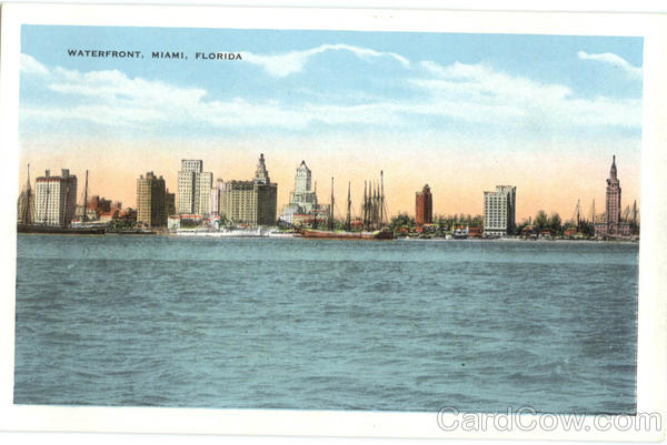 Miami's famous skyline, looking across Bay Biscayne. It affords a sweeping view of the ""Magic City"" and its line of imposing hotels on Biscayne Boulevard