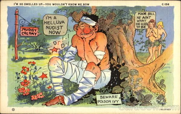 Front: I'M SO SWELLED UP-YOU WOULDN'T KNOW ME NOw C-136 I'M A eHELLUVA POOR BILL, HE AINT WHAT HE USED TО BE NUDIST NOW ANO 703 NUDIST BEWARE POISON IVY 6 A-HI685 Back: C. T. NUDIST COMICS-10 SUBJECTS