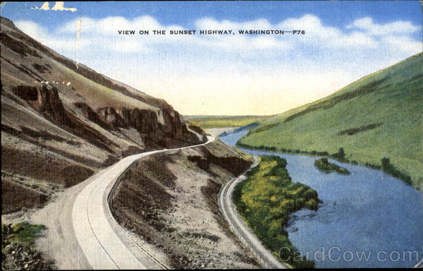 | The connecting link between Eastern and Western Washington is the Sunset Highway. Starting in the flat agricultural regions of Eastern Washington, it runs across the Cascade Mountains, through Snoqualmie Pass, down through heavily wooded areas and into Seattle. |