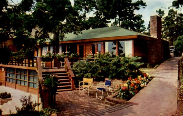 View of the suites overlooking the heated swimming pool at HIGHLANDS INN Carmel's Ocean Front Hotel Four Miles South of CARMEL-BY-THE-SEA, CALIFORNIA MIRRO-KROME CARD BY H. S. CROCKER CO., INC., SAN FRANCISCO 1, CALIF.