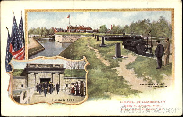 Front: THE MAIN GATE THE RAMPARTS AND THE CHAMBERLIN CHAMBERLIN GEO. F. ADAMS, MGR. FORTRESS MONROE, VA. Back: and Island Possessions Cuba, Canada and For Foreign