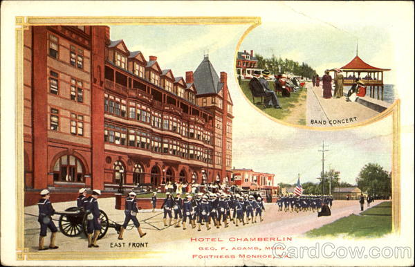 Front: EAST FRONT CHAMBERLIN GEQ. F. ADAMS, MGR. FORTRESS MONROE, VA. BAND CONCERT Back: and Island Possessions Cuba, Canada and For Foreign