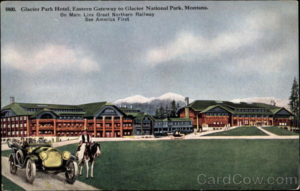 | Glacier Park Hotel, Eastern Gateway to Glacier National Park, Montana. On Main Line Great Northern Railway See America First. Just outside the boundaries of the park, on the Blackfeet Indian Reservation, is located the Glacier Park Hotel, erected by the Great Northern Railway. This hotel is built largely of huge logs and is located about 1,000 feet from the depot on a beautiful knoll overlooking the surrounding country and facing the mountains, and has every convenience of the modern hotel. |