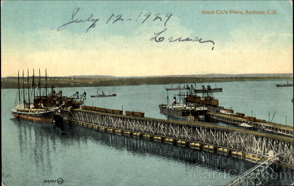 Front: 104,631. JV July 12-1929 Steel Co.'s Piers, Sydney, C.B. Back: The Valentine & Sons Publishing Co., Ltd. Montreal and Toronto FAMOUS V& SONS CARD BRITISH THROUGHOUT THE WORLD MANUFACTURE Address here