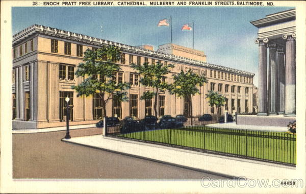 Front: 28:- ENOCH PRATT FREE LIBRARY, CATHEDRAL, MULBERRY AND FRANKLIN STREETS. BALTIMORE, MD. 44458 Back: Pub. by The Harry P. Cann & Bro. Co., Baltimore, Md. KTIMOR I Bra DUC Z MOD3