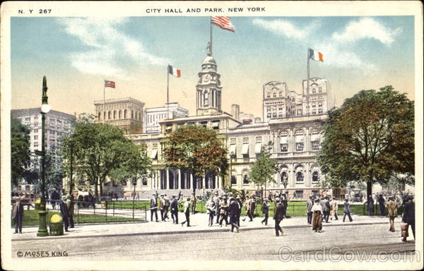 The City Hall is a white marble structure erected in 1803 at the cost of $500,000. It is the seat of the city government, chambers of the Board of Estimate and Board of Aldermen and office of the Mayor. The Park is 8ΒΌ acres. Emigrant Savings Bank Buildings in the Distance. |