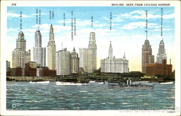 Prominent Building shown in this view are the Pure Oil Building. Carbide Building, Mather Tower. 333 Building, London guarantee & Accident Co. Building, Wrigley Buildings, Tribune Tower and Medinah Athletic Club.