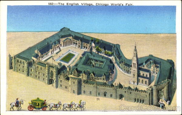 Front: 582: The English Village, Chicago World's Fair. EE 38092 Back: Pub. by Gerson Bros., Chicago, Ill. CENTURY OF PROGRESS CHICAGO WORLD'S FAIR MADEMUSA M