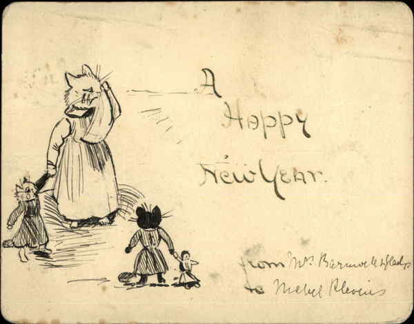 Front: Happy New Year. com Mr. Barmahlschlacht to Mabel Plevies Back: Mip Blevins Inglewood Eaton ke Coventry AM &REVENUE 215.P LLE FINY