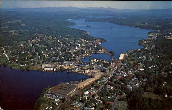 View shows lake Opechee at left, Lake Paugus and Elm Street Bridge in foreground with Weirs Bay of Lake Winnipesaukee in distance and Red Hill, Sandwich Range and Ossipee Mountains in background.