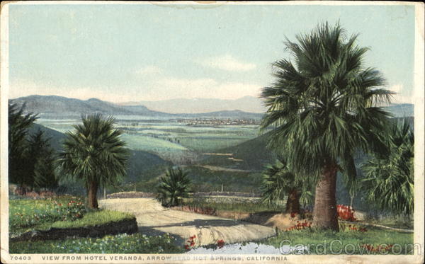 Front: T0403 VIEW FROM HOTEL VERANDA, ARROWHEAD HOT SPRINGS, CALIFORNIA Back: "PHOSTINT" TRADE MARK REG US PAT OFF MADE ONLY BY DETROIT PUBLISHING CO FOREIGN, TWO THIS SPACE MAY BE USED FOR MESSAGE. CENTS
