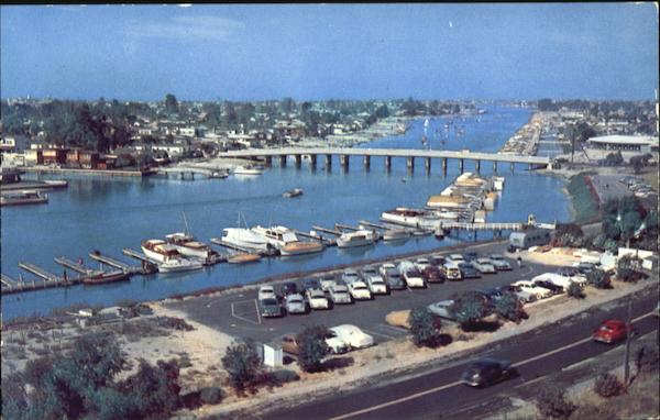 The Marine Avenue bridge connects Balboa Island California (at left) with U. S. 101 near Corona Del Mar. The Pavilion - famous Newport Harbor landmark at Balboa - appears on the horizon at upper left. Lido Isle is in the distant center, while mariner's Mile of Newport Beach fronts on the Bay at far right. |