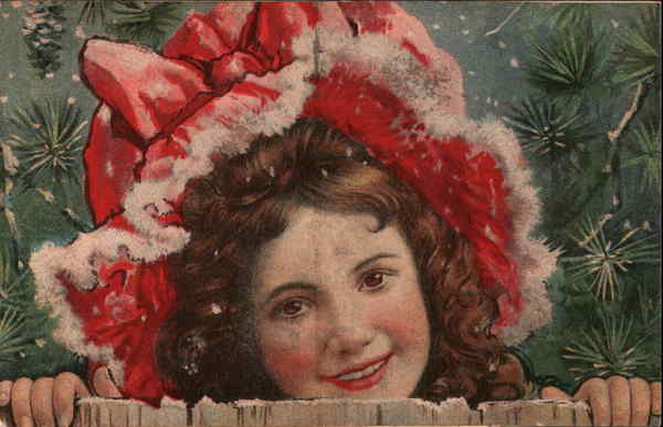 Girl in a Red Winter Bonnet Peeping over a Fence