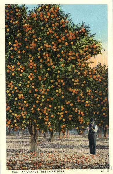 Front: 154. AN ORANGE TREE IN ARIZONA. A-31105 Back: AR PUBLISHED BY CENTRAL NEWS & NOVELTY CO. PHOENIX, ARIZONA. C. T. AMERICAN ART COLORED. 25 HERE