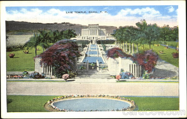 Front: LAIE TEMPLE, OAHU, T. H. Back: 8734 C9 -MADE IN U. S. A. BY E. C. KROPP CO. MILWAUKEE, WIS.(CKY) PUB. EXCLUSIVELY FOR THE ISLAND CURIO Co., HONOLULU, T. H.