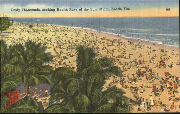 Series 400 Scientists claim as much as 15,000 tons of soot and dirt per square mile, in the air over the industrial cities of our country, thus lessening the power o the Ultra Violet Rays of the Sun. Miami Beach has no soot not dirt, consequently those health given ray of "Ole Sole" are at their best, and should be taken in small Doses, to avoid serious burns. |