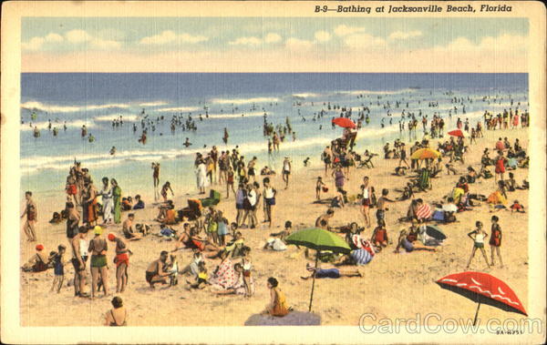 Front: B-9-Bathing at Jacksonville Beach, Florida 5A-H751 Back: DUVAL NEWS COMPANY, JACKSONVILLE, FLA.