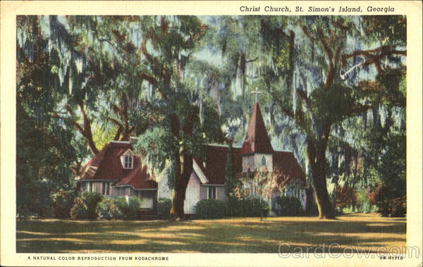 Series 3B-H1710 Christ Church, Frederica, Scint Simons Island, Georgia was established in 1736 by John and Charles Wesley, founders of Methodism, who came to Georgia at this time as missionaries of the Church of England. The present Church edifice was built in 1884 by Anson Green Phelps dodge, Jr., as a memorial to his wife, Ellen Ada phelps dodge. Mr Dodge then took Holy Orders and became the rector of the church which he had built, serving until his death in 1898. |
