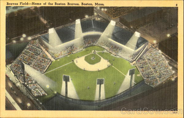 Home of the Boston Braves Baseball Team of the National League. Braves Field is located just off Commonwealth Ave. (Allston) Boston at Gaffney and Babcock Streets. It has a seating capacity of 40,000. The park was built in 1915 and lighting equipment for night baseball was installed in 1946. The filed is also the home gridiron of the Boston College Football Team. |