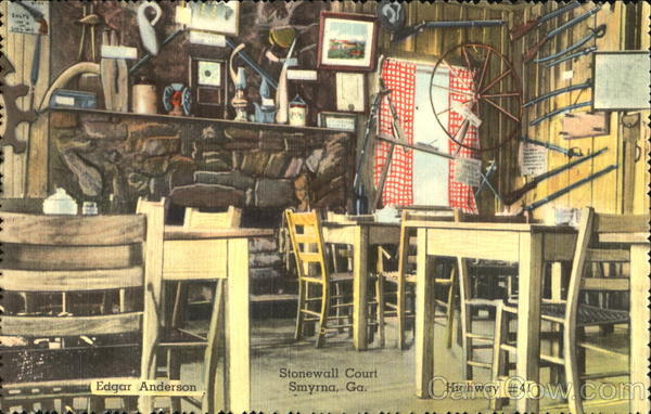 Front: Stonewall Court Smyrna, Ga. Edgar Anderson Hiqhway #41 Back: 11201 2. AA Cottages They are Different Chicken and Steak Dinners Highway #41 12 Miles No. of Atlanta 7 Miles So. of Marietta COLOUR PICTURE PUBLICATION, CAMBRIDGE, MASS., U. S. A.