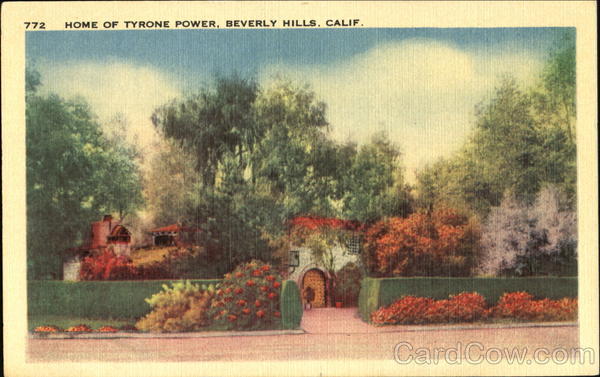 Front: 772 HOME OF TYRONE POWER, BEVERLY HILLS, CALIF. Back: MANUFACTURED BY ROBERT KASHOWER. LOS ANGELES, CALIF.
