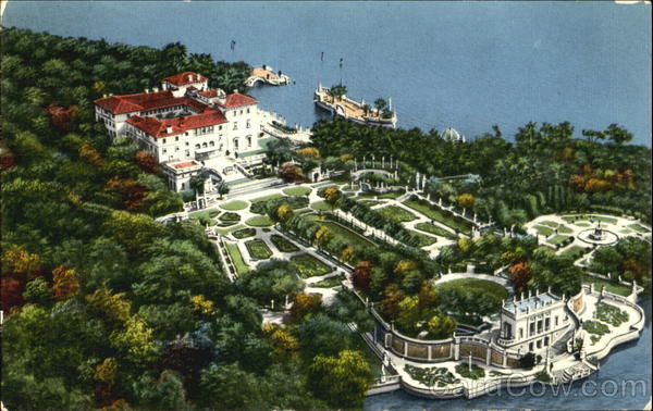 G-632 Aerial View Vizcaya-Dade County, Art Museum, Miami, Florida. 21 MADE IN USA G86941 QUALITY VIEWS. REG.U.S. PAT OFF MADE ONLY BY TICHNOR BROS. INC BOSTON 15. MASS.
