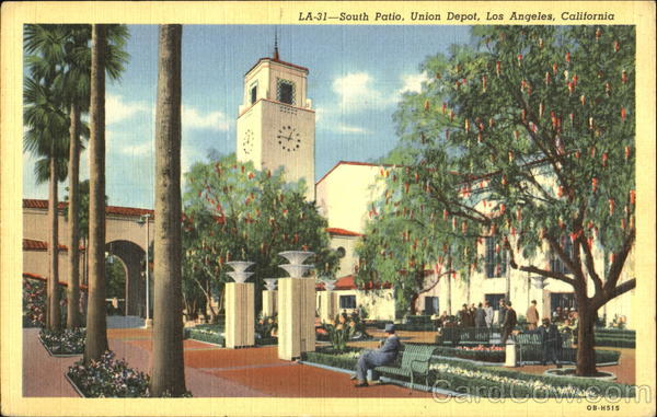Series LA-31 Typically Californian in its spacious and beautiful Spanish architecture, the new Los Angeles Union Station built at a coast of $11,000,000 provides a setting which typifies to visitors. He charm and hospitality of Los Angeles and Southern California. The tropical plantings and beautiful drives, walk-ways and shady patios, add to he charm of this most modern terminal. |