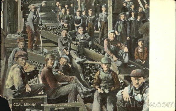 The First task of the little fellow who enters the mine to work is that of a breaker bench built across a long chute, through which passes a steady stream of broken coal, and from which he picks out the pieces of slate or rock.