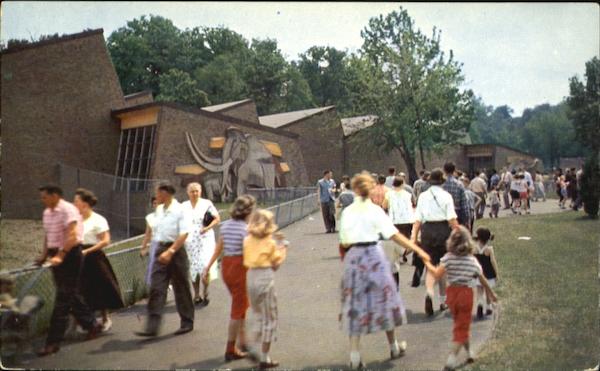Series P21116 Pachyderm Building, Cleveland Zoo, Brookside Park, one of the new modern zoo buildings in Cleveland's 210 acre zoo; air-conditioned quarters are provided large tusked animals in one of the finest zoo structures in the United States. |